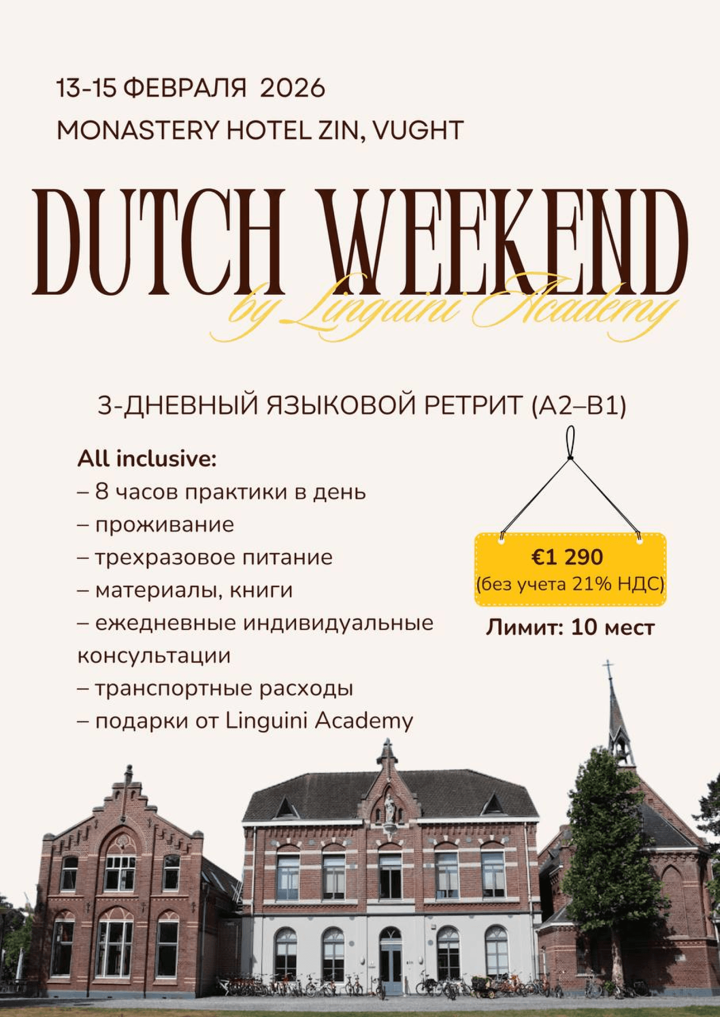Вільно розмовляє чотирма мовами: нідерландська, німецька, білоруська та російська. На її уроках ви вчите не лише мову, а й те, що реально стане в нагоді для життя в Нідерландах — від побутових ситуацій до культурних нюансів.